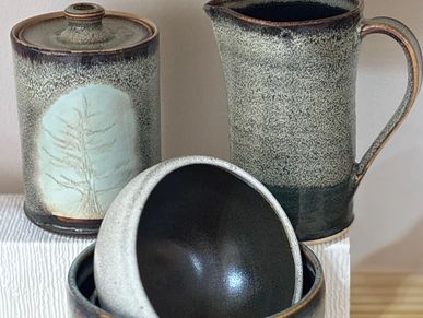 Inspired by the natural beauty of the West Coast, Kathy Johnstone creates functional stoneware pottery that reflects her love of water, trees, and the intricate patterns found in leaves. Working with both wheel-thrown and slab-built techniques, she designs tableware that is as practical as it is beautiful.