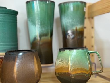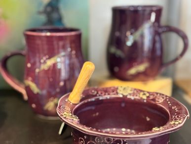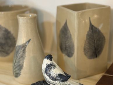 Kathy often impresses real leaves into her pieces, then uses oxides and layered glazes to highlight their delicate textures. Each piece is a reflection of nature, her creative process, and the energy she brings to the clay. For Kathy, pottery is not just about form—it’s about feeling, flow, and connection.