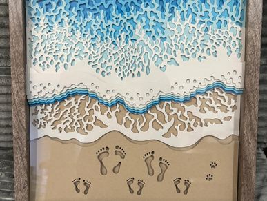 Local artist Carol Ross creates stunning ocean-themed die cut shadow boxes that bring the beauty of the sea into your space. These unique 3D pieces feature multiple layered designs for a captivating underwater effect, using custom options like footprints in the sand to reflect a personal story.
